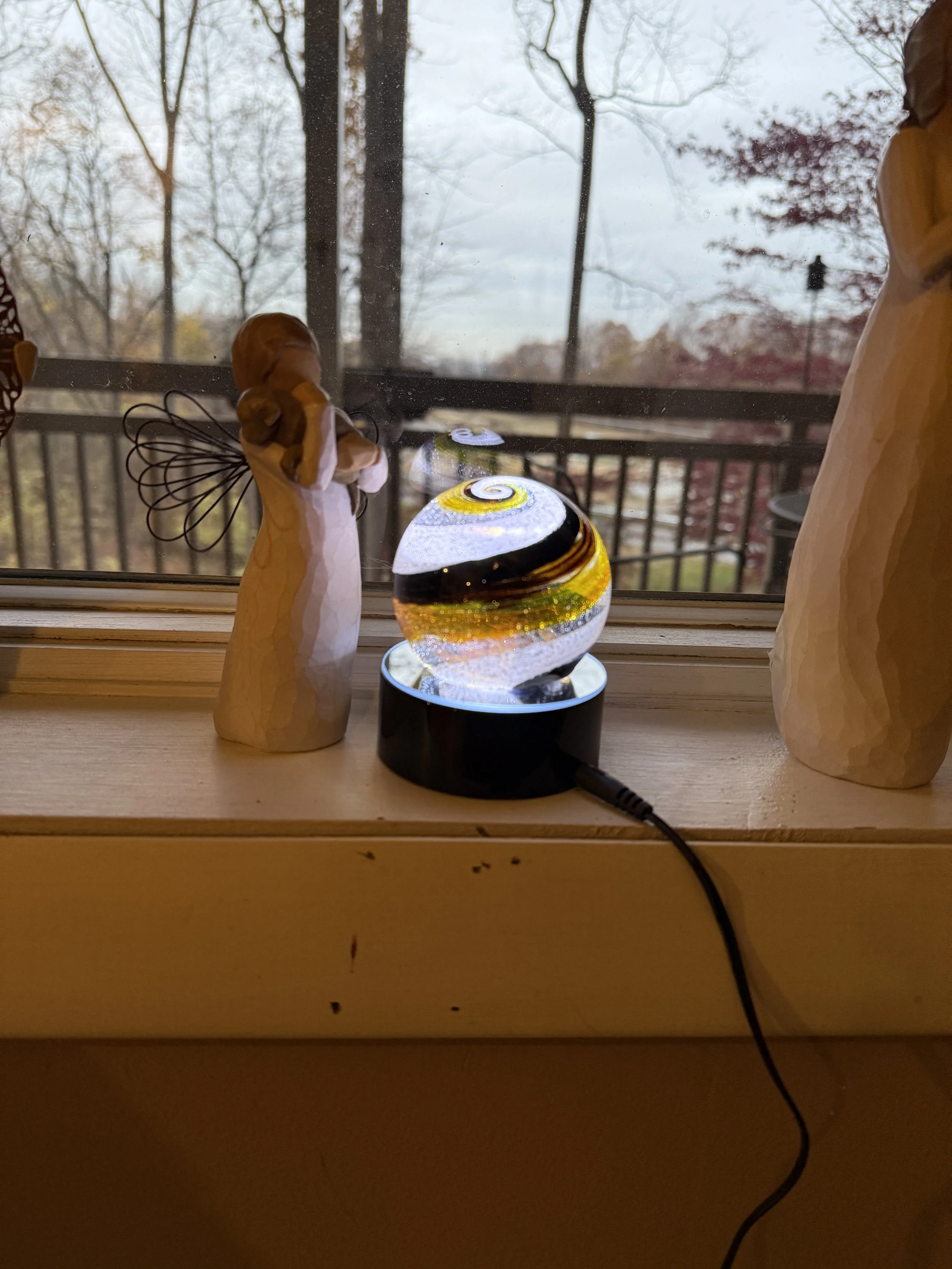 Displayed beside an angel cradling a puppy, this memorial keeps Ryder’s love close and transforms remembrance into timeless piece of ash infused solid glass memorial art.