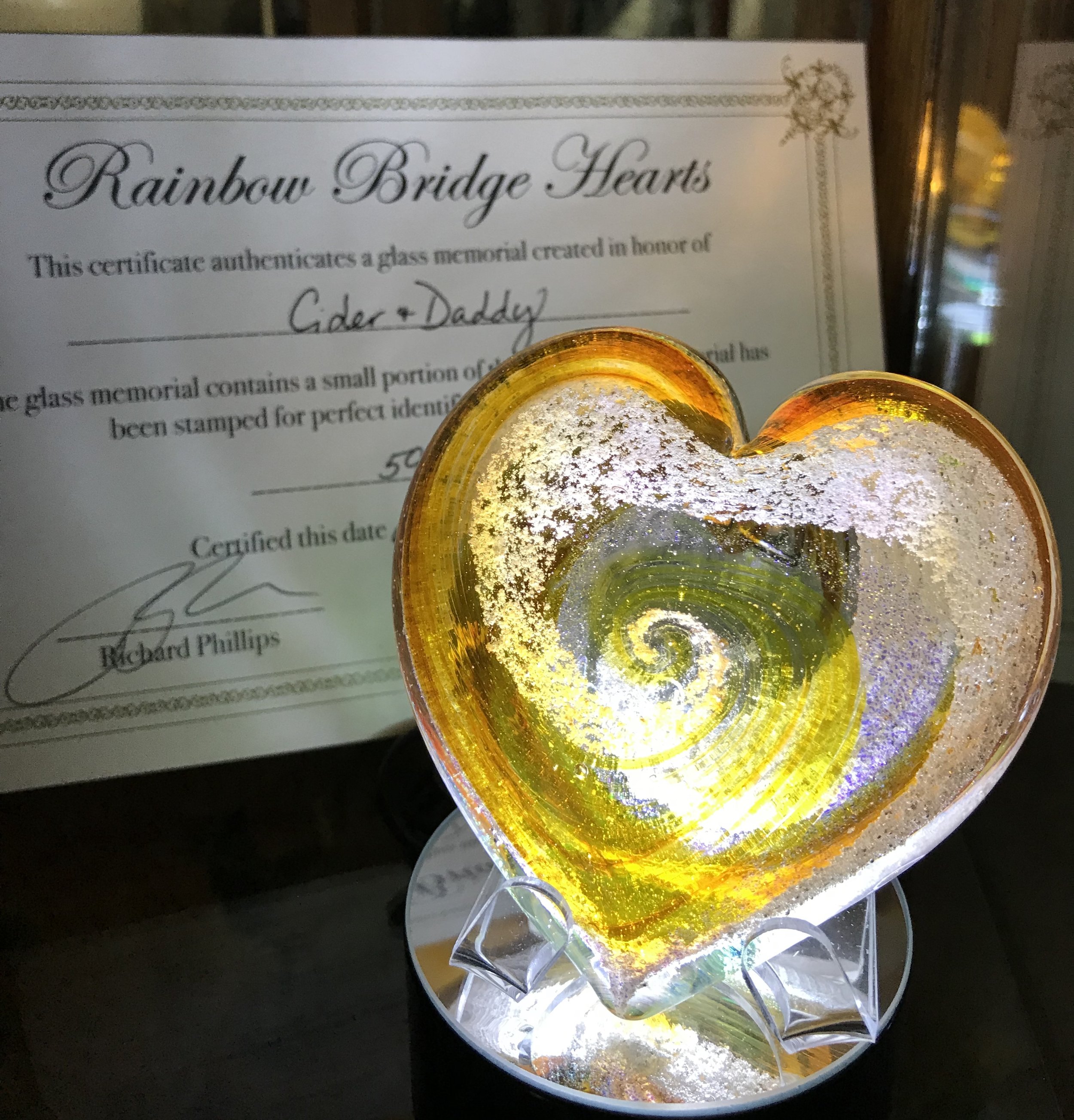 To honor Cider’s beautiful life and the bond she shared with her Daddy, her Mommy chose a truly meaningful tribute: an ash-infused Heart memorial created in Amber with Rainbow Gold sparkles, reflecting Cider’s white and tan coloring, and lovingly including some of her Daddy’s ashes as well, so they could be together forever.