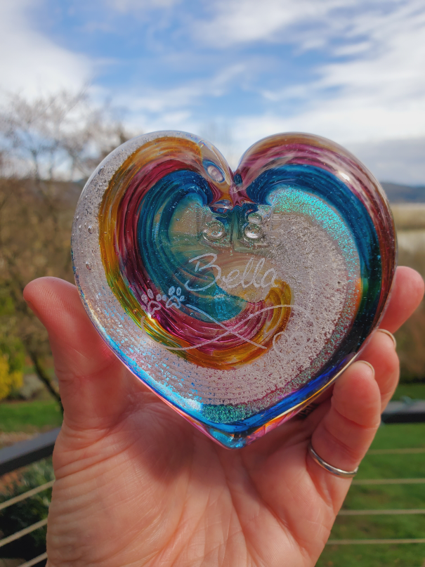 Hi Erin! Bella is home in her place of honor. Her heart memorial is so beautiful and the inscription on the back just adds that extra over the top meaning for me! I truly love it!! Thank you so much for the care and reverence you showed her while she visited with you all. Your company is definitely doing “heart” work helping those that have lost a family member start to heal. THANK YOU THANK YOU THANK YOU to all the RBH team! Tammy H.
